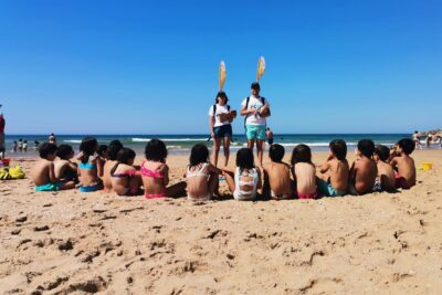 Junto à entrada das praias, os monitores da Valorlis convidam a população a separar corretamente os resíduos