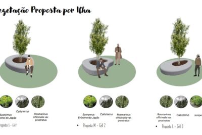 São no total 10 ilhas compostas por floreira, banco e algumas com candeeiro inteligente.