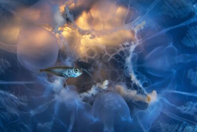 A imagem retrata um carapau juvenil a nadar sincronizado com uma alforreca.