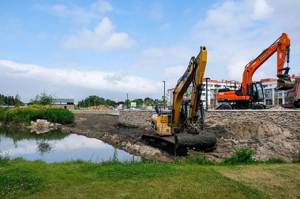 Para evitar o assoreamento do lago e do coletor da ribeira do Amparo, está a ser construída uma bacia de retenção.